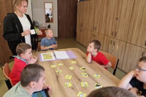 Podczas zajęć wychowankowie korzystali z symboli PCS przedstawiających różne zwierzęta – m.in. psa, kota, lwa, konia, słonia czy ptaka. Dzieci słuchały odgłosów zwierząt i dopasowywały je do odpowiednich obrazków. Wspólnie segregowały zwierzęta na domowe i te które można spotkać w zoo oraz brały udział w grze dźwiękowej – naśladując dźwięki zwierząt.