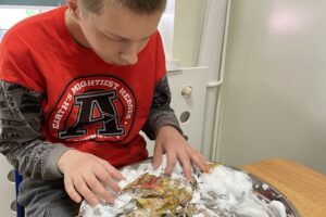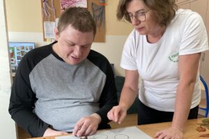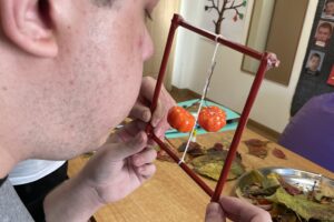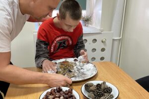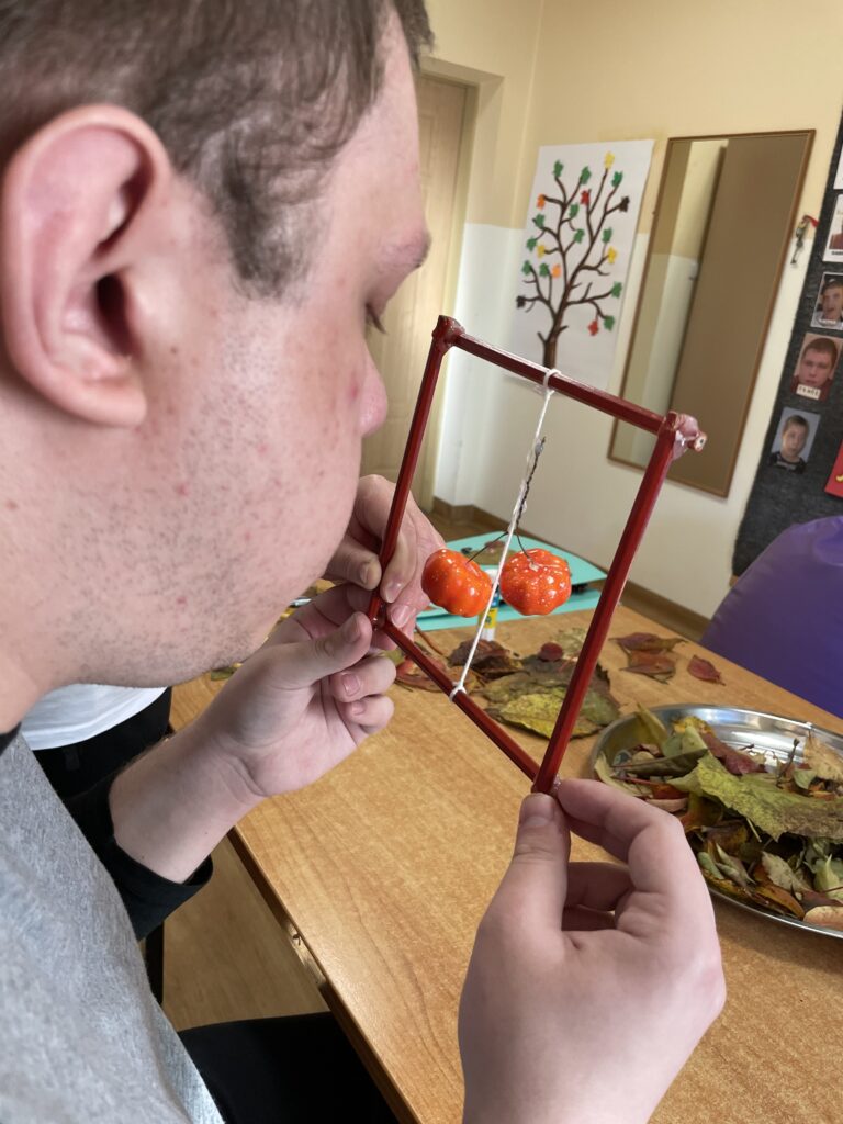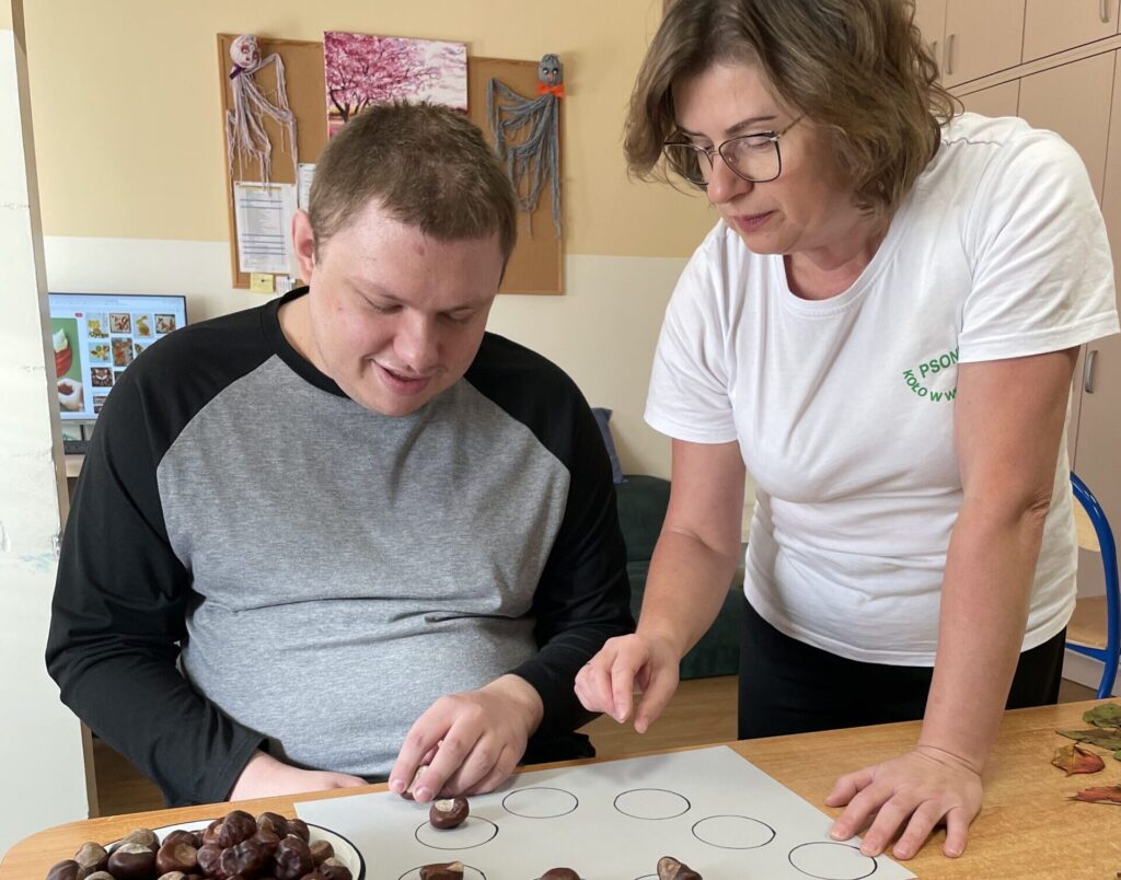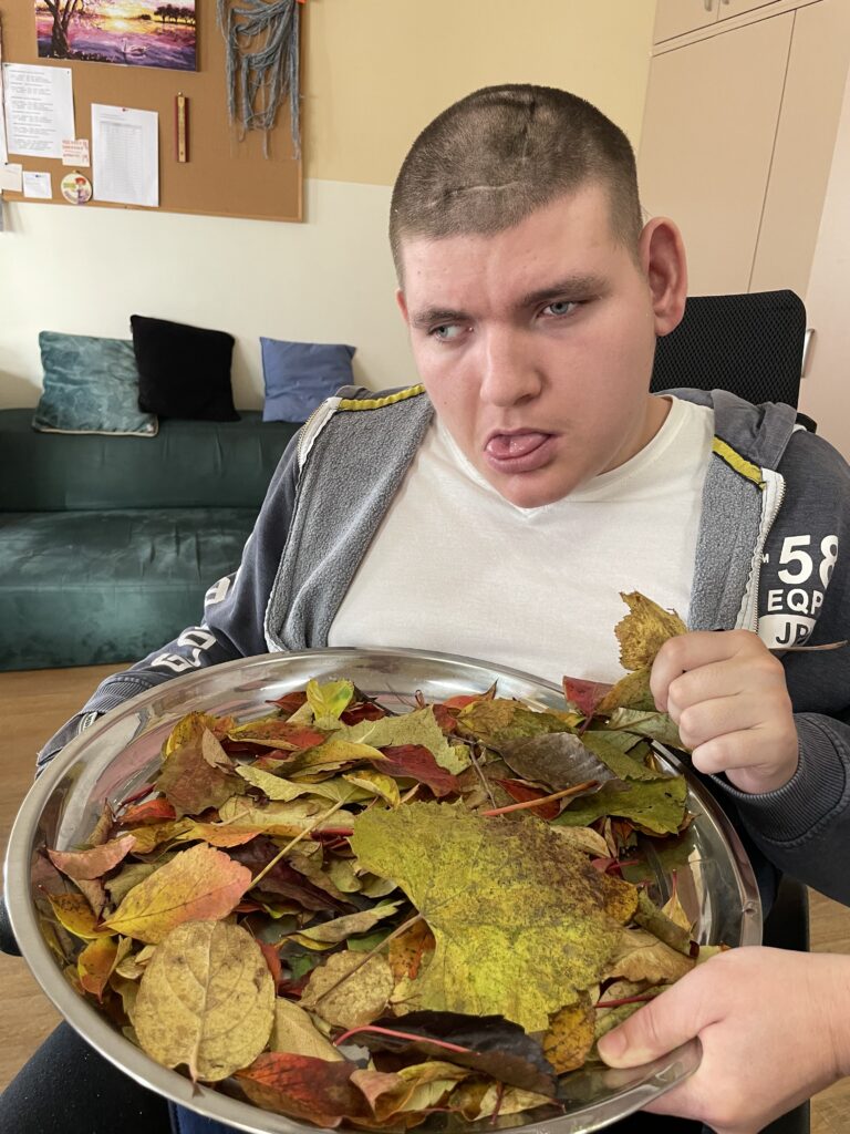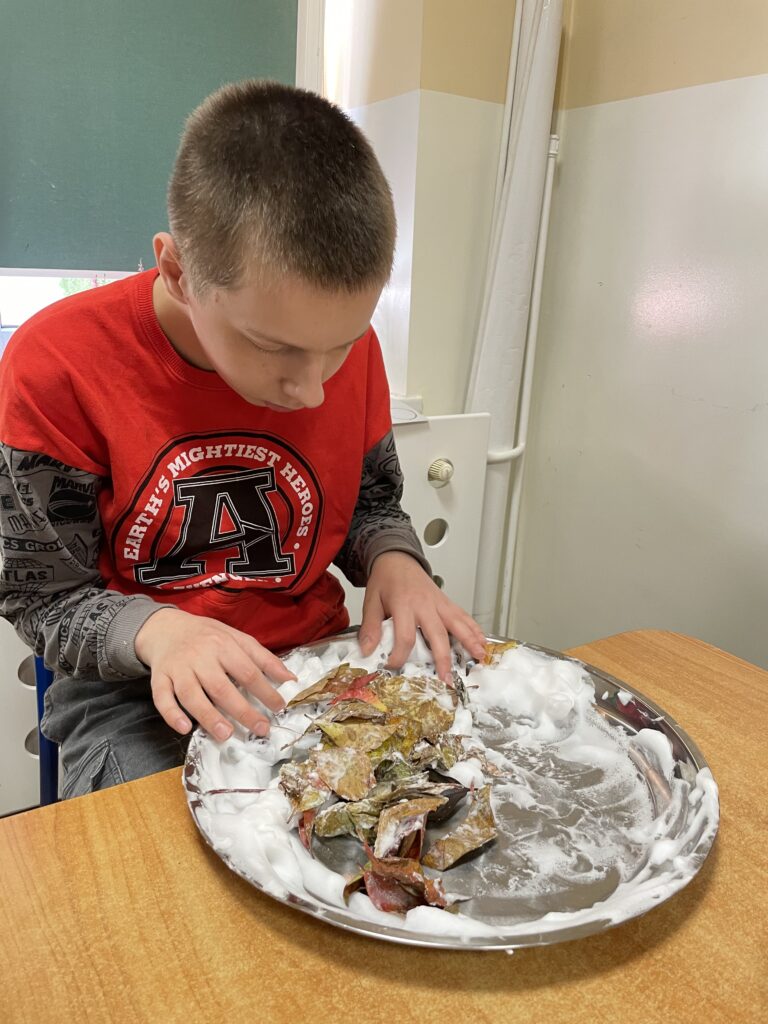 Podczas dzisiejszych zajęć wychowankowie z I i II ZRW uczestniczyli w zajęciach sensorycznych z wykorzystaniem jesiennych darów natury – kasztanów, szyszek i liści.