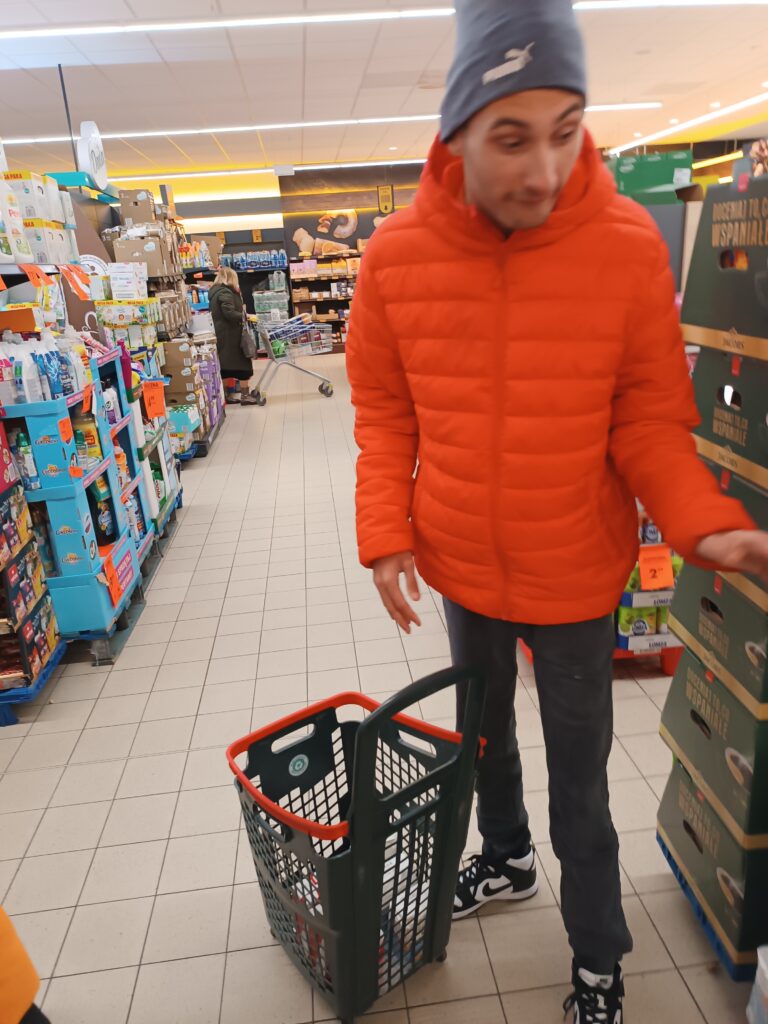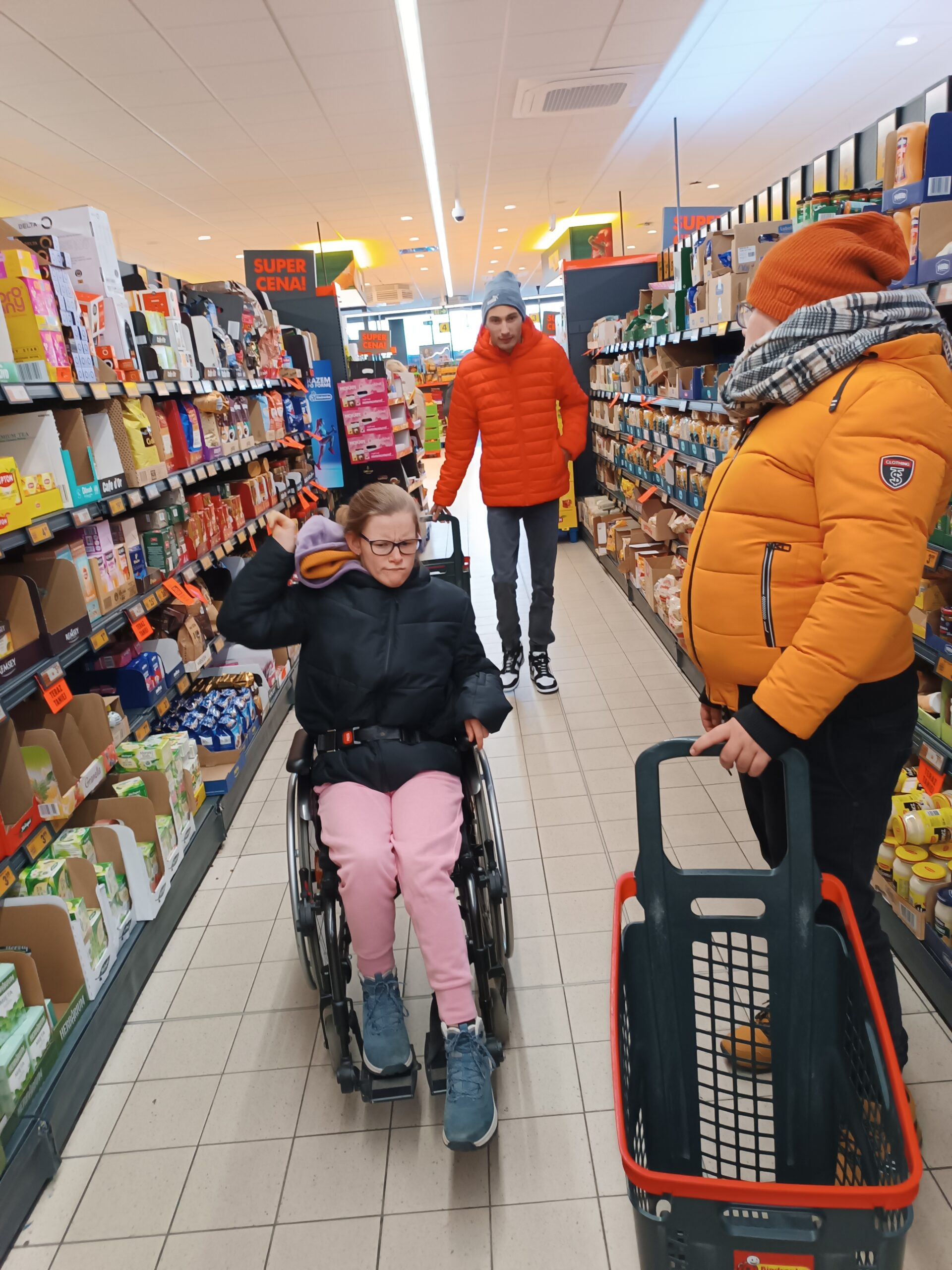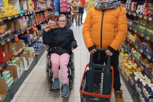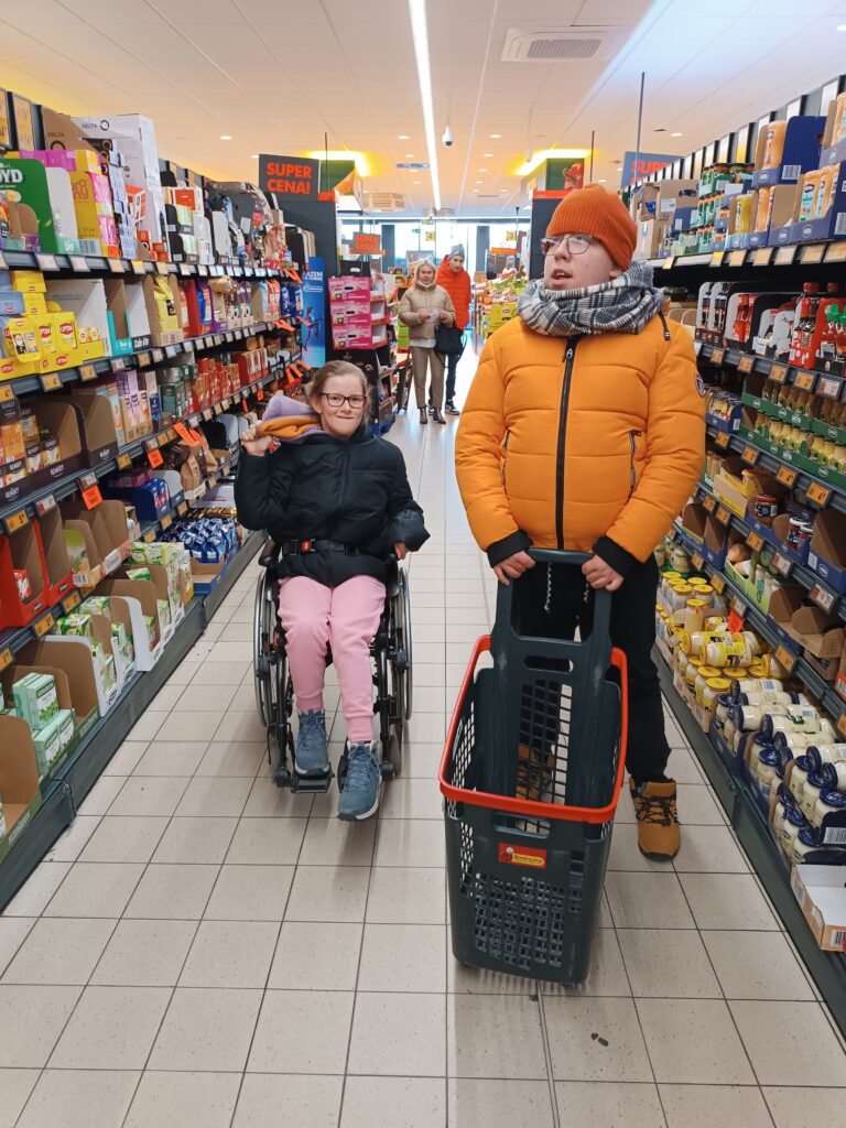 Druga część wyjazdu miała charakter gospodarczy. Uczestnicy udali się do pobliskiego supermarketu, aby zakupić produkty niezbędne do zaplanowanych zajęć kulinarnych – pieczenia świątecznych pierniczków. Była to cenna lekcja orientacji w sklepie, planowania wydatków i dokonywania przemyślanych wyborów konsumenckich.