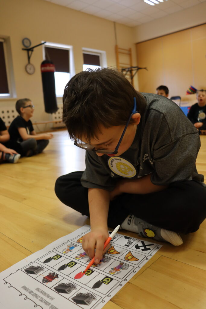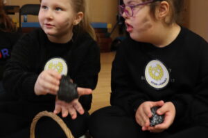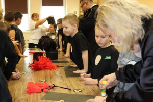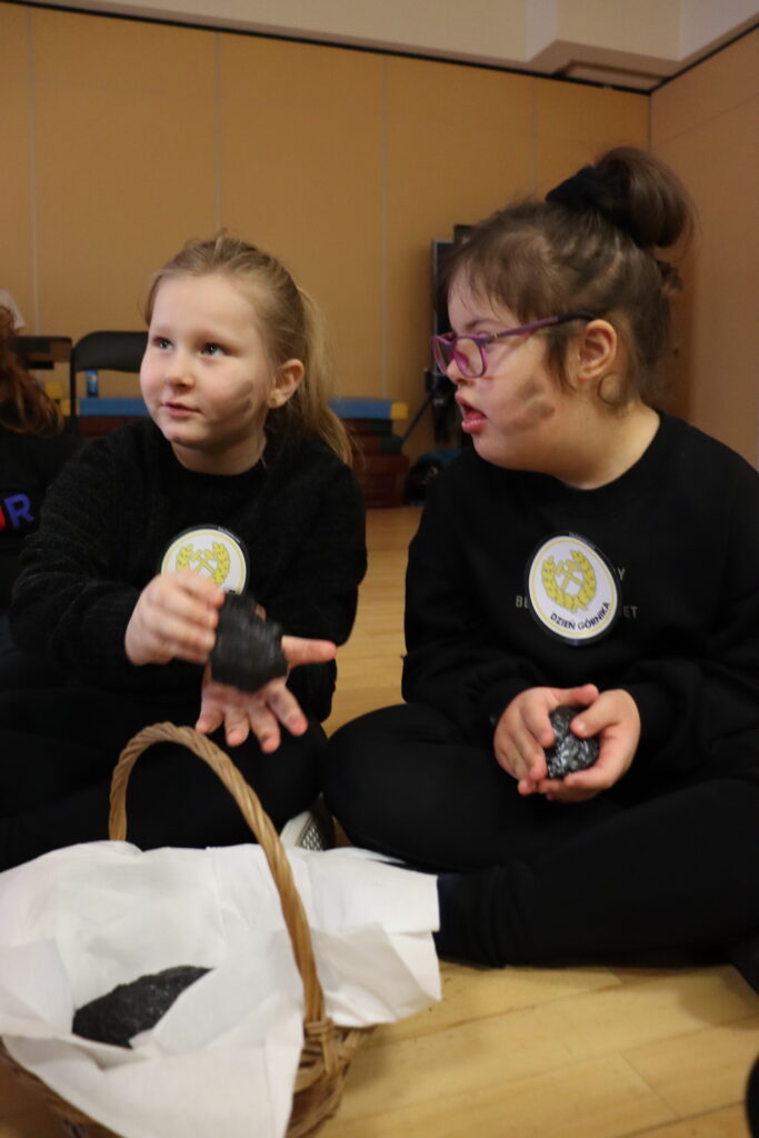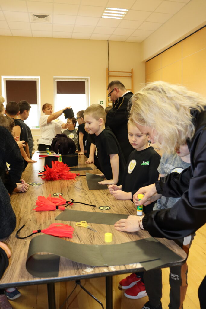 Co się działo? Każdy mógł z bliska zobaczyć i dotknąć prawdziwą bryłę węgla (sprawdzaliśmy, czy brudzi rączki! 😉). Pani Paulinka zaczarowała nas historią o „Rozgniewanym węgielku”, która wprowadziła nas w klimat podziemnych skarbów. Na koniec zamieniliśmy się w artystów! Powstały przepiękne, papierowe czaka. Było klejenie kolorowych pióropuszy z bibuły i precyzyjne mocowanie borty. Efekt? Zobaczcie sami na zdjęciach!