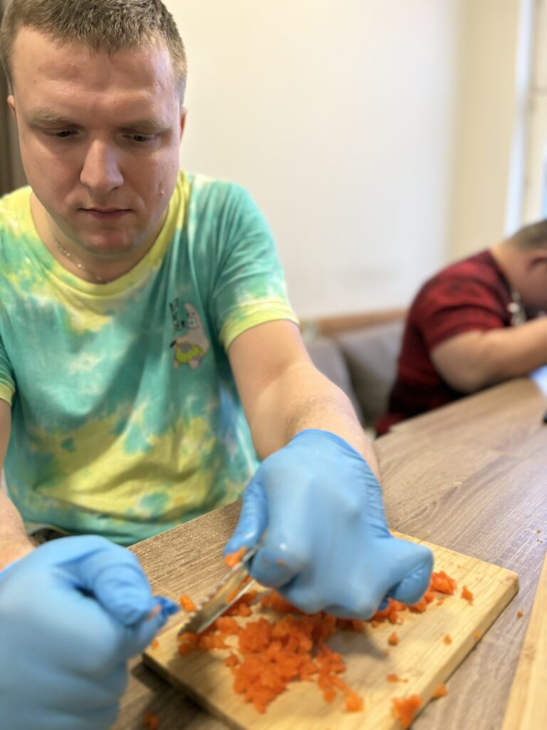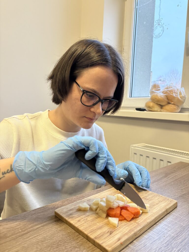 W naszych mieszkaniach treningowych zapachy domowego obiadu to codzienność, która skrywa w sobie niezwykle ważny proces terapeutyczny. Ostatnie zajęcia upłynęły pod znakiem kulinarnej klasyki – wspólnie z uczestnikami przygotowaliśmy tradycyjną sałatkę jarzynową.