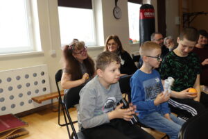 Wychowankowie, jak zawsze, aktywnie i z entuzjazmem uczestniczyli . Na zakończenie spotkania Pani Melodia stworzyła magiczny, zimowy nastrój, śpiewając piosenkę „Hu hu ha nasza zima zła”, co idealnie korespondowało z aktualną aurą panującą za oknem.