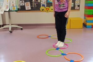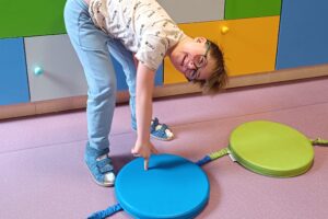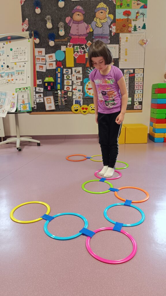 Motoryka duża: Zwieńczeniem zajęć był kolorowy tor przeszkód, który uczył koordynacji i orientacji w przestrzeni.