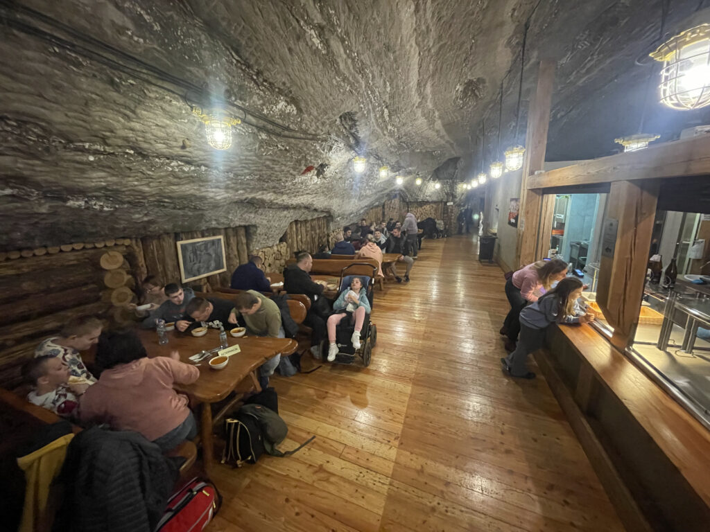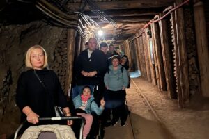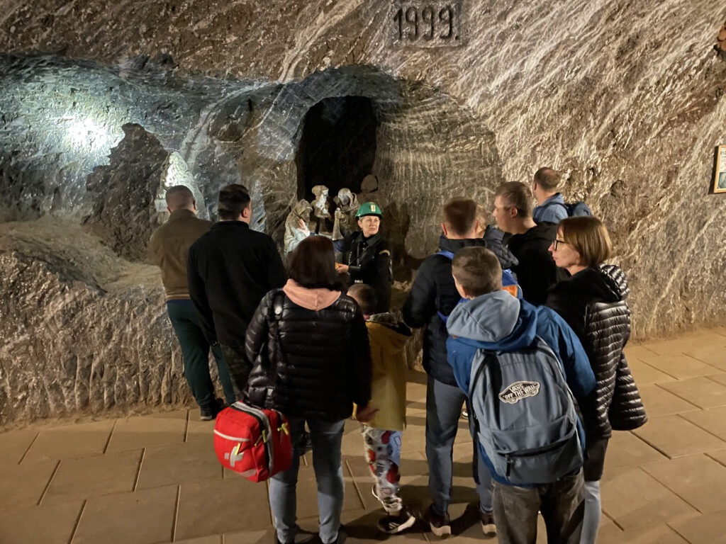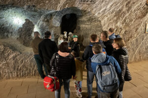 Była to niezwykła podróż przez najstarsze i najpiękniejsze wyrobiska kopalni. Zwiedzanie rozpoczęliśmy od zjazdu pod ziemie ciemnym, wilgotnym szybem Campi, gdzie zjechaliśmy na głębokość 212 metrów. Kolejny etap wycieczki przebyliśmy pieszo. Za pomocą holograficznych, interaktywnych inscenizacji o przestrzennych słuchowisk pokazane zostały średniowieczne techniki wydobywcze, zwyczaje górnicze oraz inne aspekty z życia kopalni.