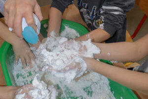 Przez zabawę masą ze skrobi i pianki: